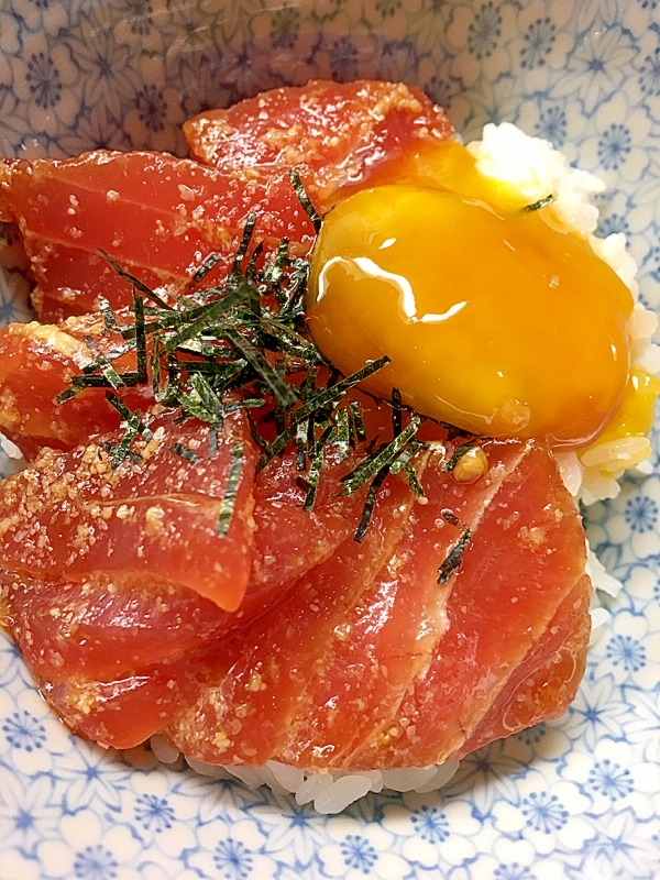 作り方 (1)漬けタレの材料を鍋に入れ、弱火で沸騰させる。 アルコールが飛んだら火を止めて冷ます。 (2)マグロを好みのサイズに切る。 (刺身を買った場合はそのまま)バッおつまみ用のユッケは、5分程度の漬け時間でok。手早く簡単にできて、お酒が進む美味しさです。 しっかりと味をつけた漬けマグロは、手毬寿司や散らし寿司のネタにおすすめです。 カツオを 丼にご飯をよそい漬けマグロを乗せ、刻みのりとごまを散らしたら完成! 濃厚な漬け丼と「 まごころの一杯 三種のきのこ 」は鉄板の組み合わせ! 簡単なのに豪華な食卓になります